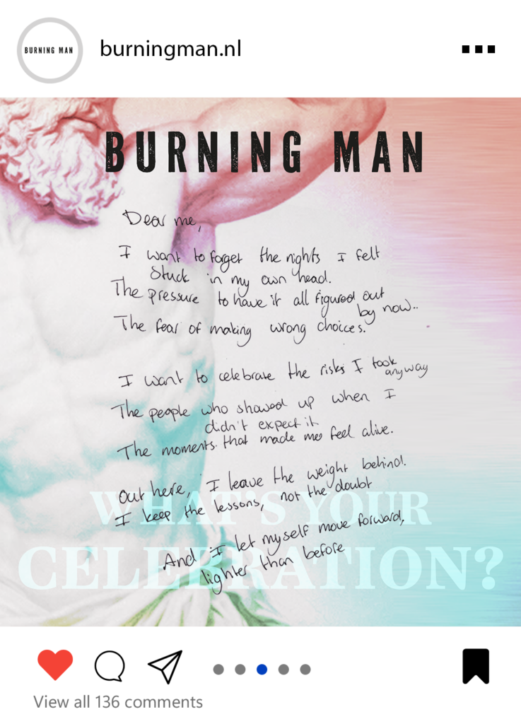 The project burning man NL holds the idea of sharing and celebrating your memories Whether it is about something to mourn about, or it is something that is to celebrate. The concept is to embrace and to let go of the past.